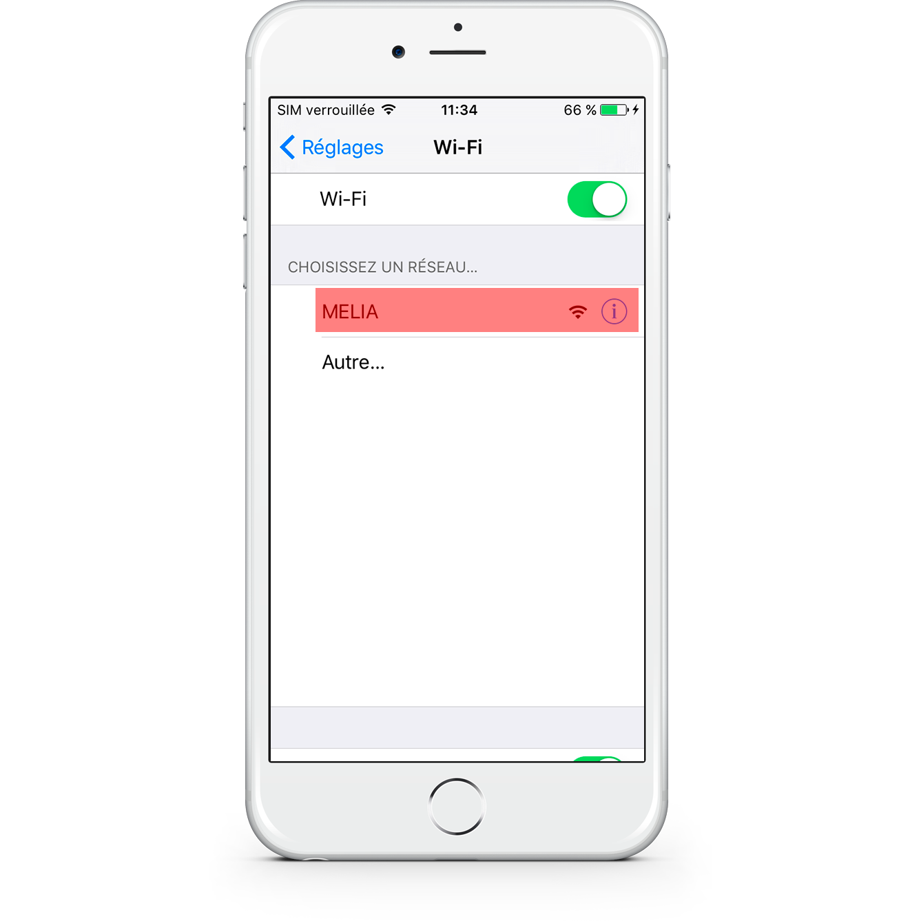 Choisir celui qui est nommé Melia. Ce réseau est affiché sans cadenas, permettant à l’utilisateur de se connecter sans nom d’utilisateur ni mot de passe