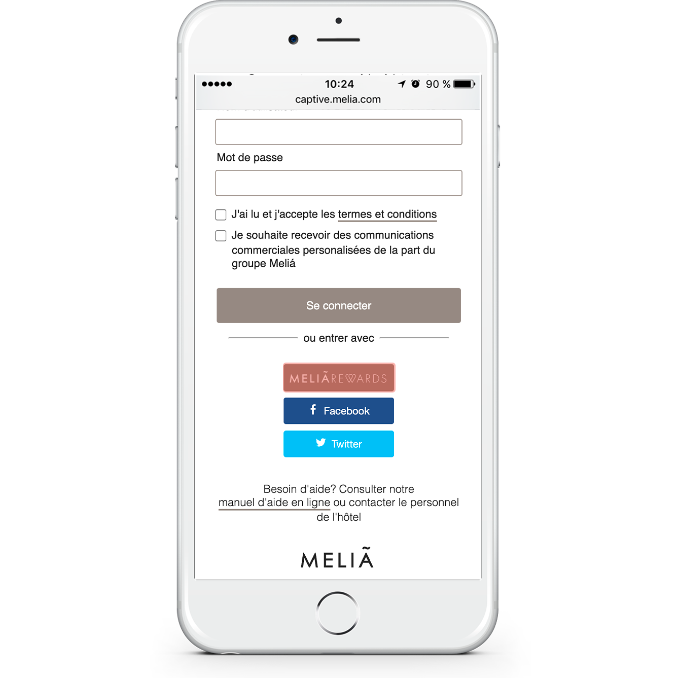 Si le client dispose déjà d’un compte MeliáRewards, il peut se connecter en utilisant les données de sa carte. Il doit indiquer son nom et l´adresse électronique, ou son numéro de carte MeliáRewards. L’écran d’identification permet également de s’inscrire au programme grâce à l’option « S’inscrire à MeliáRewards ». Une fois le processus de validation achevé, le client sera redirigé vers la page d’accueil de l’hôtel et pourra naviguer sur Internet.