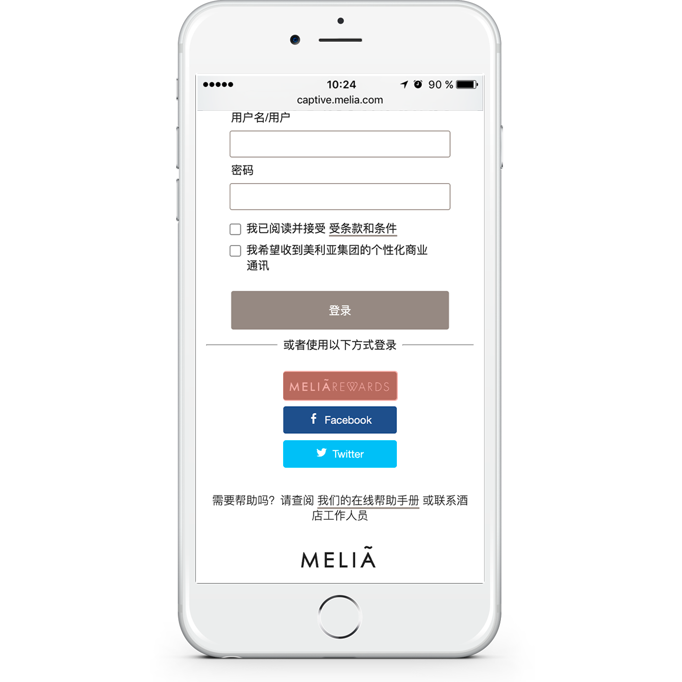 MeliáRewards美利亚心礼程会员可以在登录页面使用会员信息登录。客人可以使用注册心礼程会员时登记的姓氏和邮箱,或者使用会员号码登录。客人也可以通过登录页面上的 “加入心礼程”选项直接注册成会员。验证通过后,客人将被重定向到酒店主页,并可以开始使用互联网
